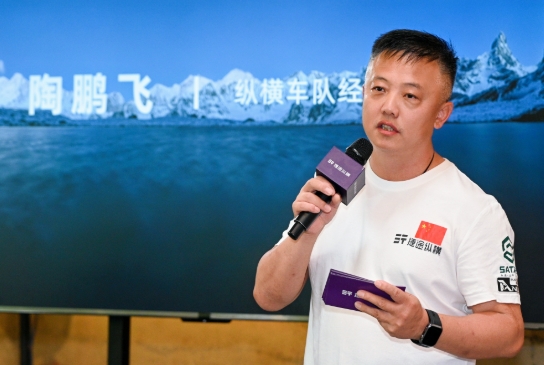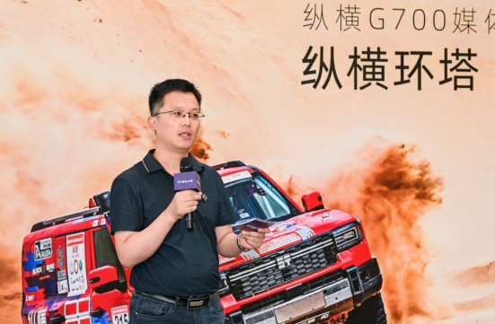 纵横车队经理陶鹏飞现场分享纵横G700“我命由我不由天”的赛场表现。面对突如其来的沙尘暴,纵横G700凭借智能全地形模式、非承载式车身+三把差速锁等全地形越野能力,上演“沙海脱困”。