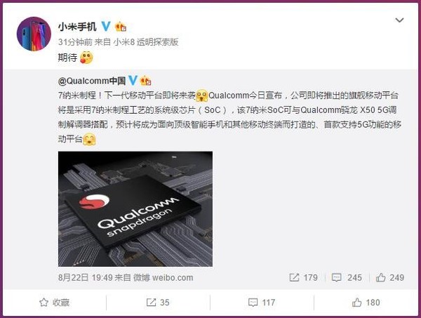 日前,高通官方微博发布了一条消息,称采用7nm制程的下一代移动平台即将来袭,并强调即将推出的旗舰移动平台将是一款系统级芯片(SoC),无疑就是即将面世的骁龙855了!在这条公告发出两天之后,小米手机官方微博在今天下午转发了@Qualcomm中国 的这条微博,转发语是“期待!”小米手机在期待什么呢?三星Note9已经推出,短时间内三星应该不会推出旗舰机了,因此骁龙855的首发机型很有可能就是小米MIX 3!